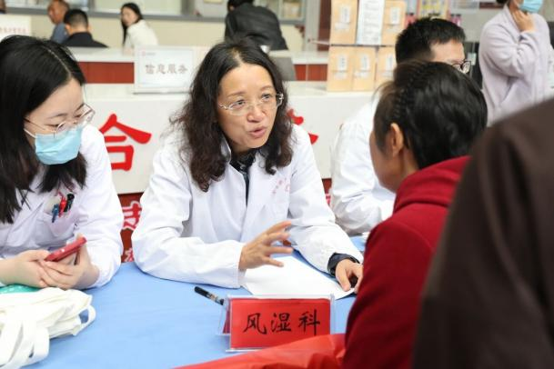 义诊现场,南京市中医院肛肠科、风湿病科、妇科、护理专家团队,与金寨县中医医院医护人员协同配合,为当地群众提供医疗诊疗、健康咨询,中医护理等服务。